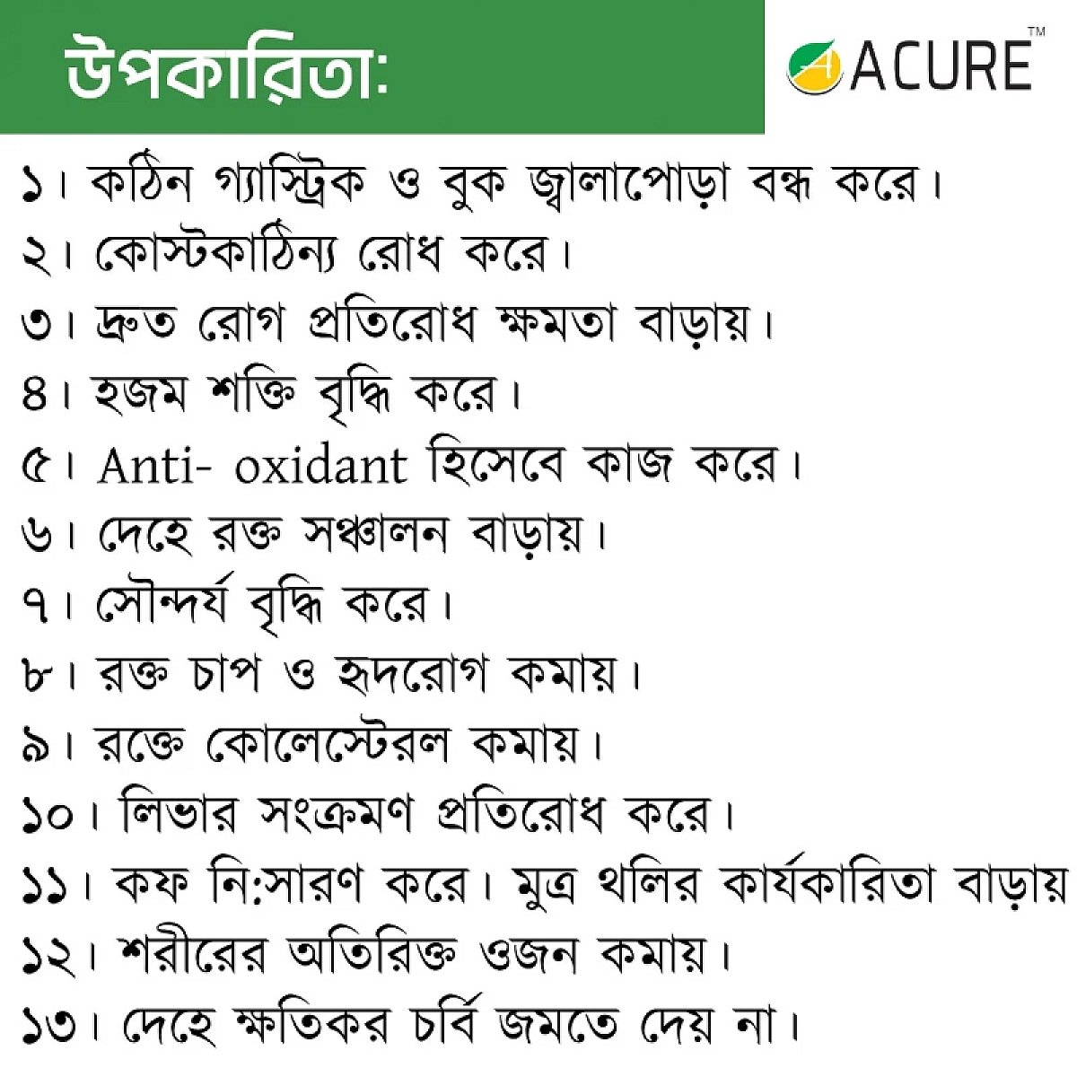 ১. কঠিন গ্যাস্ট্রিক ও বুক জ্বালাপোড়া বন্ধ করে। ২. কোস্টকাঠিন্য রোধ করে। ৩. দ্রুত রোগ প্রতিরোধ ক্ষমতা বাড়ায়। ৪. হজম শক্তি বৃদ্ধি করে। ৫. Anti- oxidant হিসেবে কাজ করে। ৬. দেহে রক্ত সঞ্চালন বাড়ায়। ৭. সৌন্দর্য বৃদ্ধি করে। ৮. রক্ত চাপ ও হৃদরোগ কম...